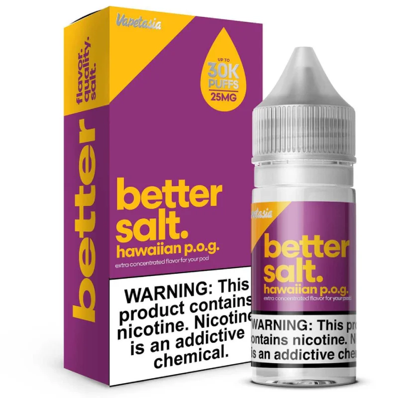 Disfruta un auténtico sabor tropical con Better Salt Hawaiian POG de Vapetasia, un e-liquid de sales de nicotina inspirado en la clásica mezcla hawaiana de maracuyá (passion fruit), naranja fresca y guayaba. Una combinación exótica, dulce y cítrica que ofrece una experiencia refrescante y llena de sabor en cada calada.